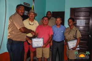Mayor Daniel Guerrero and Minister of Tourism and Civil Aviation, Honourable Manuel Heredia Jr., joined Officer in Charge of the Coastal Executive Unit, Superintendent Henry Jemmott, Deputy Assistant Superintendent Dehanne Augustine and Caribeña Fuels representative Israel Alpuche in presenting the awards.