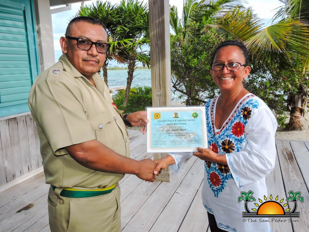 San Pedro Belize Tourism Association Chapter Chairwoman Tamara Sniffin was invited as the key note speaker at the end of the training and commented, “This is a great opportunity for business on the island to be better prepared for crime. The program is free and offers valuable information on how to be aware of your surroundings and how best to respond to certain situations. The more businesses who participate in this training the better, together we can serve as a very effective way to deter crime, with all eyes and ears open and aware at all times. I thank Mr. Orio for putting together the Tourism Watch program and congratulate Cayo Espanto for being the first in the country to participate.”