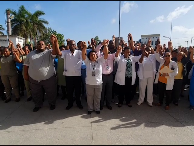 Over one hundred workers of Karl Heusner Memorial Hospital (KHMH) in Belize City held a protest in front of the hospitals building on Thursday, July 11th. Led by KHMH Workers Union President Lidia Alpuche-Blake, the group is upset over a June 28, 2019 memo in which CEO Michelle Cox-Hoare informed that they are not pensionable.