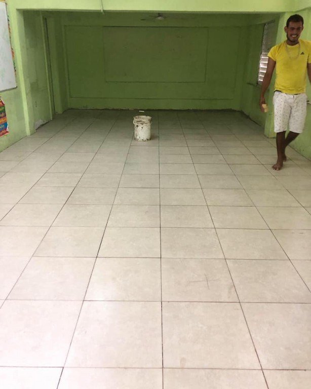 The projected started at the beginning of July, and the money was raised via Blue Water Grill’s monthly charity guest donations. From January through June 2019 they raised money to tile the first-floor classrooms at SPRCS. In total, guests at The Phoenix and customers at Red Ginger, Wine de Vine, and Blue Water Grill donated 8,881.24 dollars. They matched this amount 100% for a total amount of 17,762 dollars. However, the project cost was $30,000, as it included repairing the existing concrete subfloor and pouring screed, along with the approximately 4,500 square feet of tile, materials, and labor. As such, Blue Water Grill decided to contribute an additional 12,500 dollars to reach their $30,000 goal.
