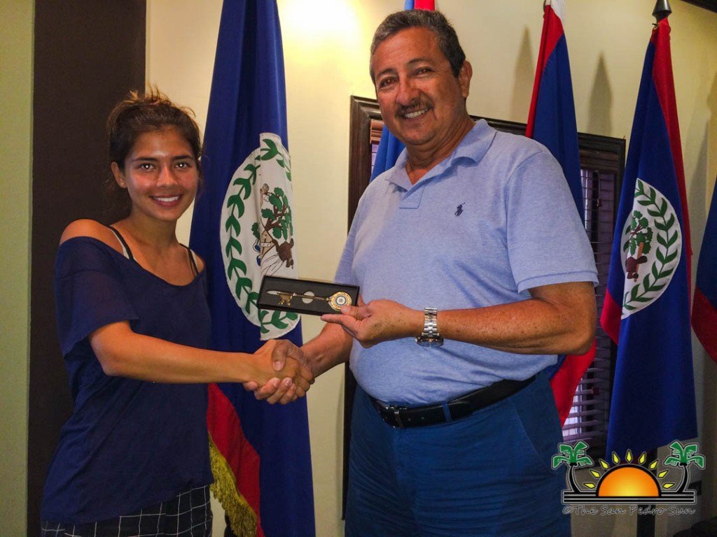 On Wednesday, July 31st, Mayor Daniel Guerrero received a visit from Werner Graf and his daughter Angelina Graf to discuss a proposal of a Sister City relationship between San Pedro Town and Sea Isle City, New Jersey, USA. The Grafs came on behalf of the City Council of Sea Isle City and presented Guerrero with the keys to the city, which bears the name of Mayor Leonard Desiderio.