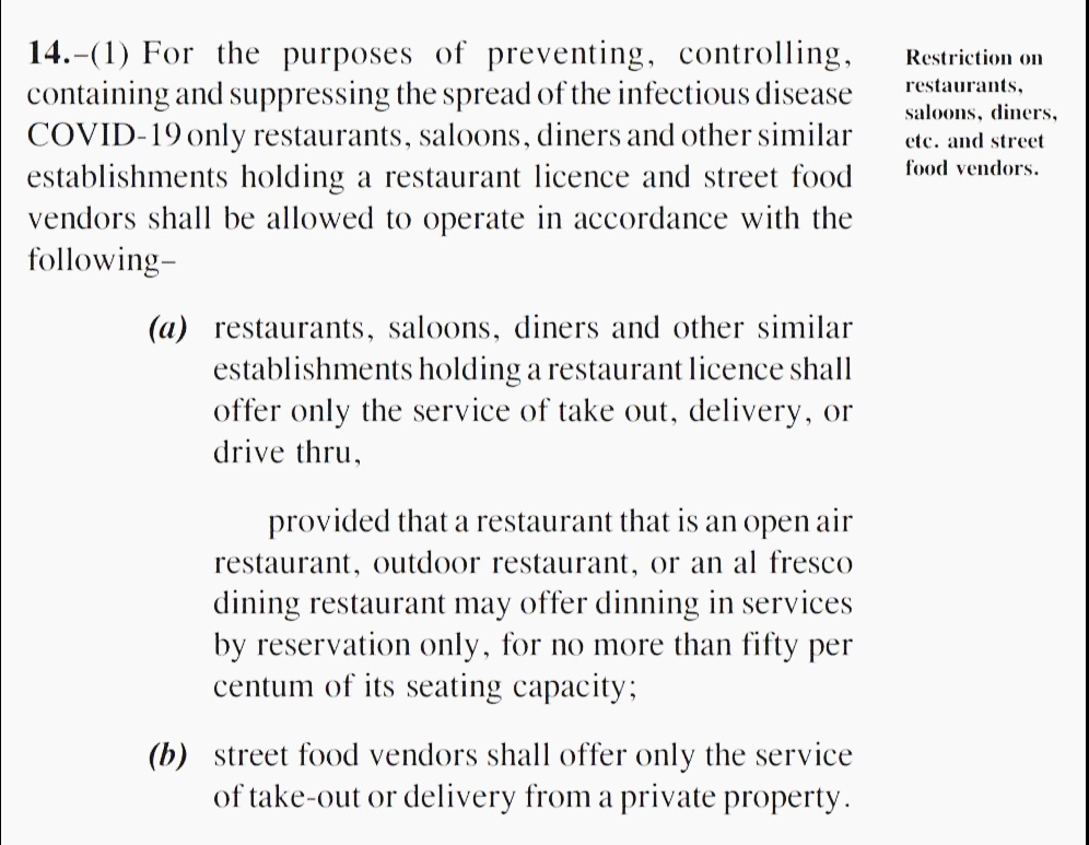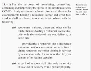 Later that day, SI amendments were issued in agreement with these recommendations and stated that establishments with no outdoor space could only offer takeout or/drive-thru/and takeout services.