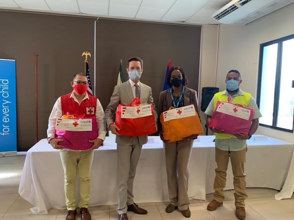 In a ceremony today at the San Ignacio Town Council Hall, U.S. Embassy Belmopan and its implementing partner UNICEF handed over emergency response kits to Belize’s National Emergency Management Organization (NEMO) and the Belize Red Cross. These kits were purchased through an ongoing $300,000 United States Agency for International Development (USAID) grant to UNICEF launched in August to assist UNICEF in its work to reduce the risk and impact of COVID-19 on vulnerable children and adolescents in Belize.