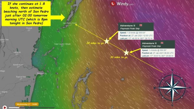 A record-breaking journey involving a toy pirate ship is about to include Belize in its itinerary. Initiated by 11-year-old Ollie and 8-year-old Harry Ferguson from Scotland, the little pirate ship dubbed ‘Adventure 2’ or A2 is currently floating about 12 nautical miles south-east of San Pedro Town, Ambergris Caye. If it stays on this course, it is expected to land somewhere north of the island after 8PM today, January 27th. A2’s journey can be followed on Facebook via https://www.facebook.com/tdajp.
