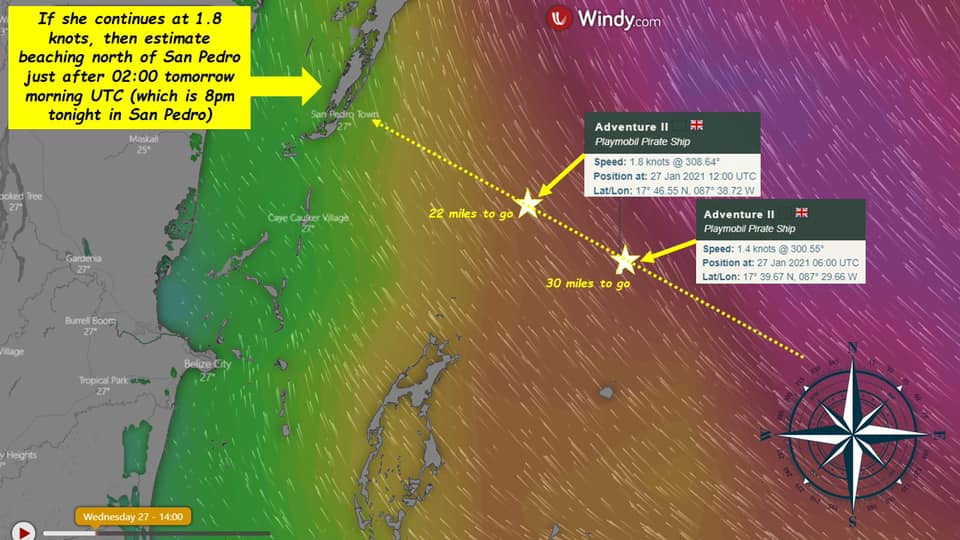 A record-breaking journey involving a toy pirate ship is about to include Belize in its itinerary. Initiated by 11-year-old Ollie and 8-year-old Harry Ferguson from Scotland, the little pirate ship dubbed ‘Adventure 2’ or A2 is currently floating about 12 nautical miles south-east of San Pedro Town, Ambergris Caye. If it stays on this course, it is expected to land somewhere north of the island after 8PM today, January 27th. A2’s journey can be followed on Facebook via https://www.facebook.com/tdajp.
