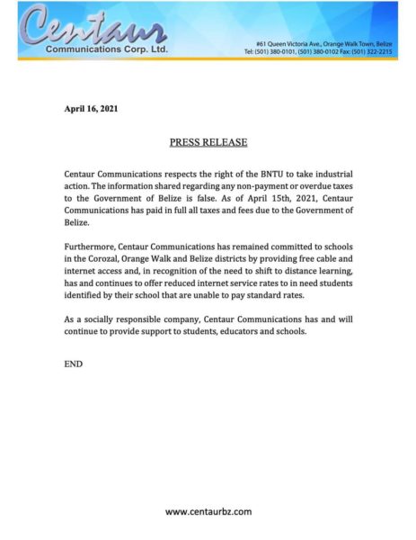 The statement read, ‘As of April 15, 2021, Centaur Communications has paid in full all taxes and fees due to the Government of Belize.’