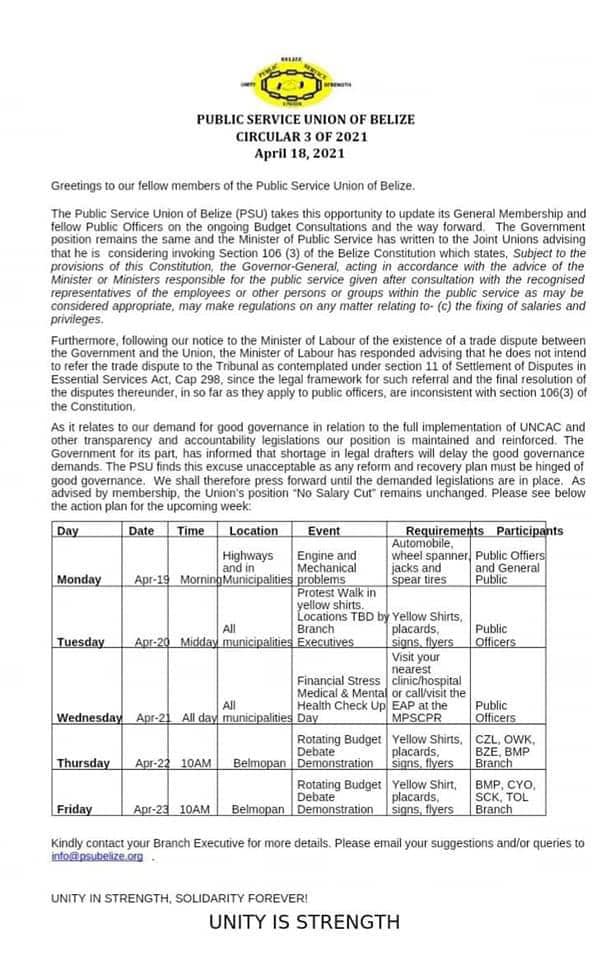 The PSU issued a statement on Sunday, April 18th, indicating that industrial action is a must after the Minister of Public Service sent a letter informing them of considering invoking Section 106 (3) of the Constitution of Belize. With this section of the Constitution, the minister apparently plans to have the Governor General make regulations regarding salaries.