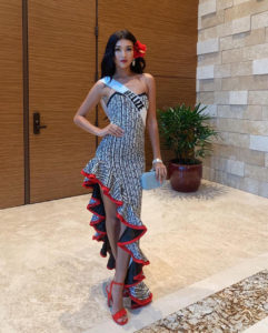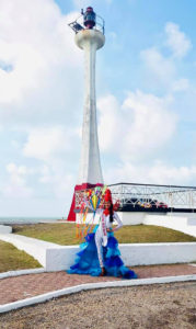 Salguero said that the national costume represents the lighthouse, and her headpiece lights up. She said initially the outfit had a blue trail illustrating the water and identifying her as an island girl, along with kites that people tend to fly during the month of March when Baron Bliss is celebrated. These details have since been modified. Salguero said that the meaning behind the national costume is to share a part of Belize’s history and how Baron Bliss’s love benefited the country.