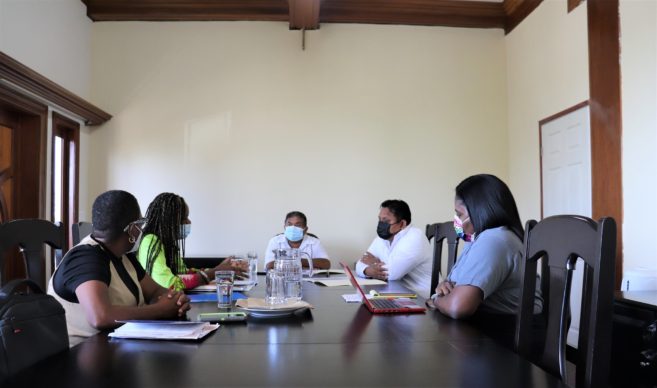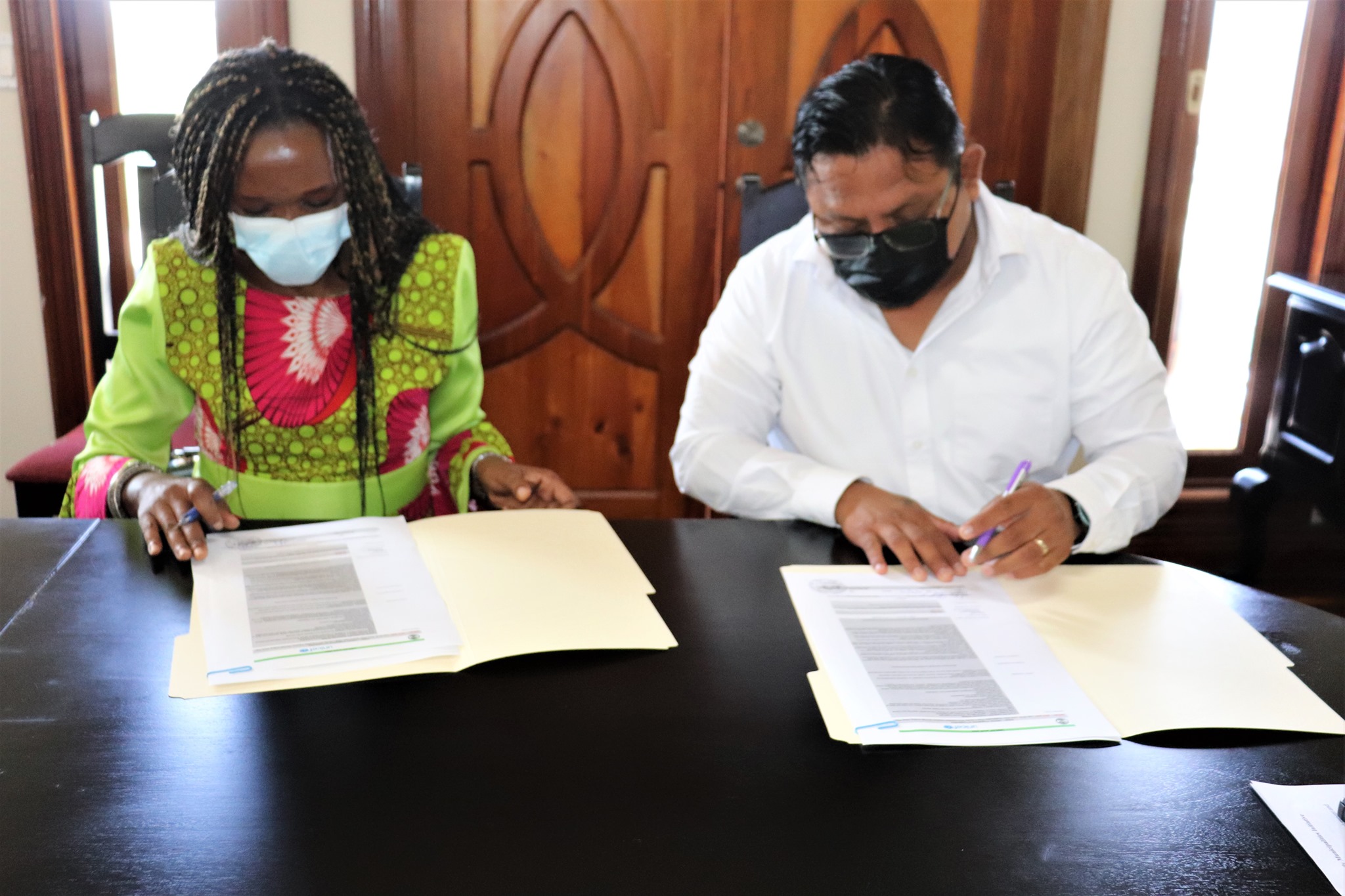 Present for the signing were Hon. Oscar Requena, Minister of Rural Transformation, Community Development, Labour and Local Government; Mr. Valentino Shal, CEO in the ministry; Mrs. Lauren Cayetano, local government officer; Ms. Alison Parker, UNICEF country representative; and Ms. Paulette Wade, UNICEF monitoring and evaluation officer.