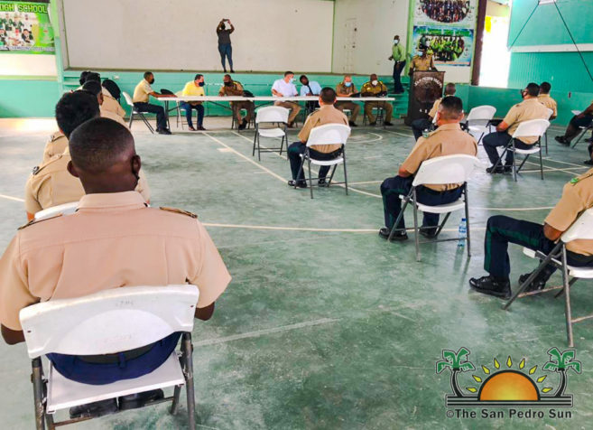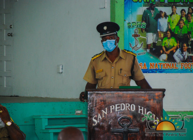 The short meeting held at the Angel Nuñez Auditorium included addresses commending the work of the island police formations. Master of Ceremonies Assistant Superintendent Basil Reyes briefed Musa on the policing done in San Pedro with their force of 85 officers. ComPol Williams commended Noble’s leadership which has significantly reduced crime on the island. Two years ago, Noble took over as the Officer in Charge of the islands; today, he is the newly created Region Four commander covering the Cayes. Williams told the officers that the security of the Cayes is critical. Their responsibility is great, and they should do their job with pride. He added that there will always be crime; thus, hard work should never stop.