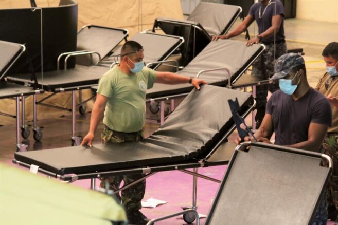 Early this morning, members of the US Southern Command and Belizean authorities were observed erecting a field hospital at the UB gymnasium in Belmopan City. Unofficial information is that this field hospital will be used for COVID-19 patients. The country’s main referral hospital, Belize City’s Karl Heusner Memorial Hospital (KHMH), is reportedly at full capacity. If more people continue getting ill with the virus, additional facilities to treat COVID patients will be needed. This field hospital will be prepared for such use in case the national health system becomes unsustainable.