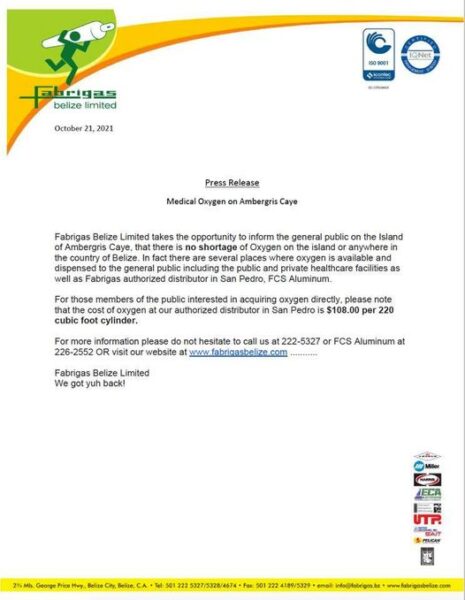 On Thursday, October 21st, Fabrigas Belize Limited issued a press release indicating there was no longer a shortage of oxygen in San Pedro Town. The company later explained that there was an issue on the island with a customer who was re-selling oxygen without proper authorization. The customer is Abner Bacab an Emergency Medical Technician (EMT) who operates Island Emergency Services. At times Bacab would tend to emergencies and provide patients with oxygen and at the end of the service, a fee is charged. Fabrigas has stopped selling oxygen to Bacab in large quantities because according to them, he is not a dealer or a doctor authorized to provide such interventions.