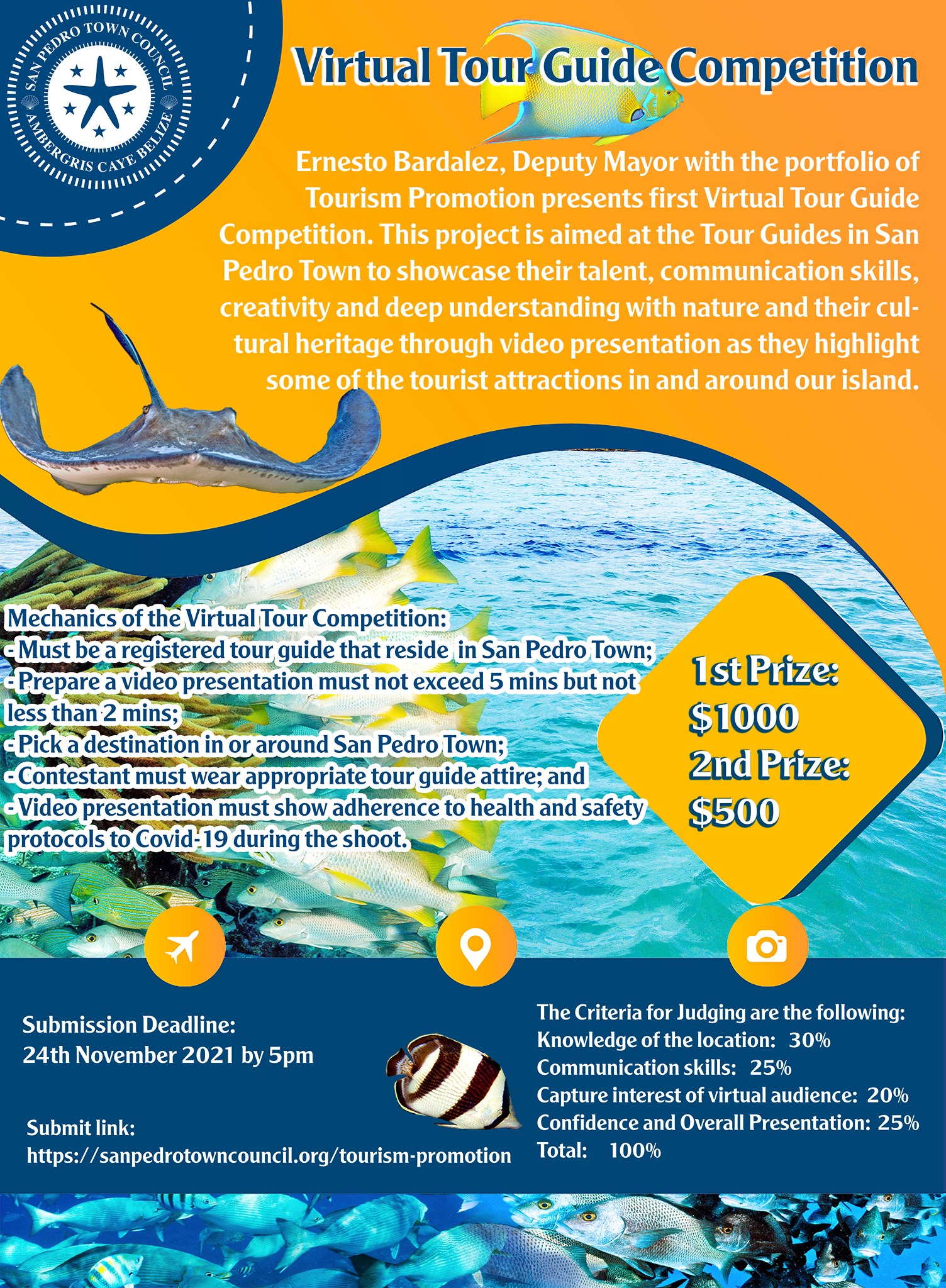 A project designed to highlight the hard-working tour guides of San Pedro Town is being organized by Deputy Mayor Ernesto Bardalez. Tour guides are invited to participate in a virtual competition showcasing their talent, communication skills, creativity, and deep understanding of their job and cultural heritage through a video submission. Tour guides participating can submit their videos to https://sanpedrotowncouncil.org/tourism-promotion by November 24, 2021. A $1,000 prize will be awarded for the top video and $500 to the runner-up of the competition.