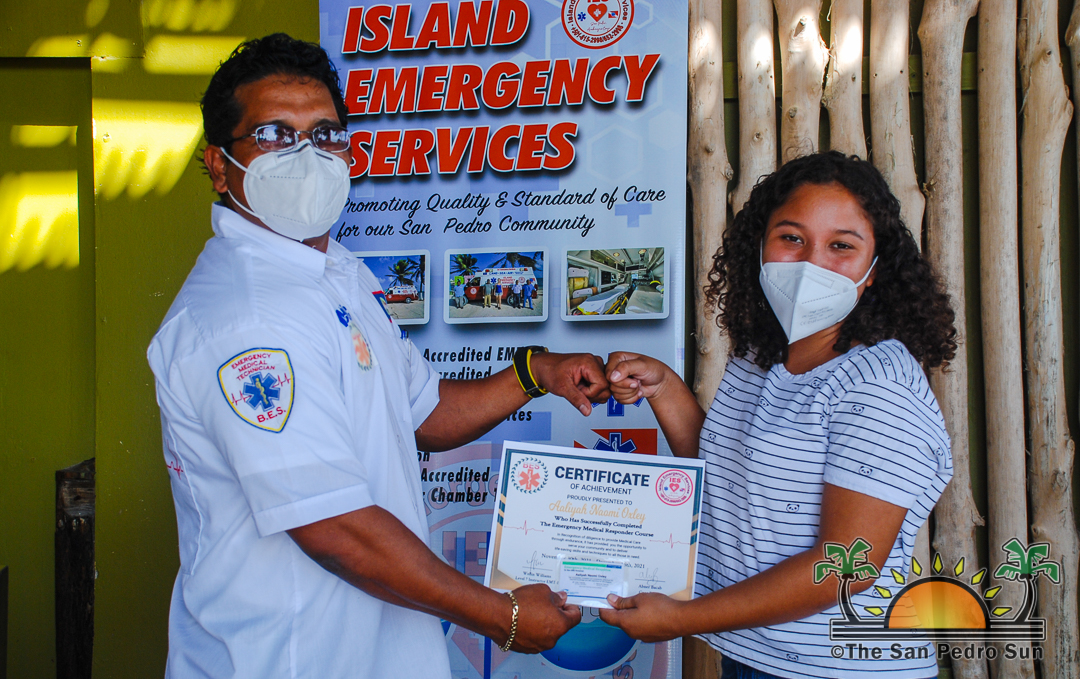 Next was the presentation of the certificates by EMT, BLS, and Emergency Medical Response Level 7 Instructor Wellin Williams. The proud students certified include Aaliyah Oxley (Honor Roll), Lera Young, Claudio Tzul Jr., Lorena Saquic, Crista Gonzalez, Martin Dawson, Shimonique Chimilio, Jailene Cab, and Cesar Cerpa. Many of the new Medical First Responders shared with The Sun that they learned a lot of helpful information and techniques in training. They considered it very motivational, and a career in medicine is now on their radar.