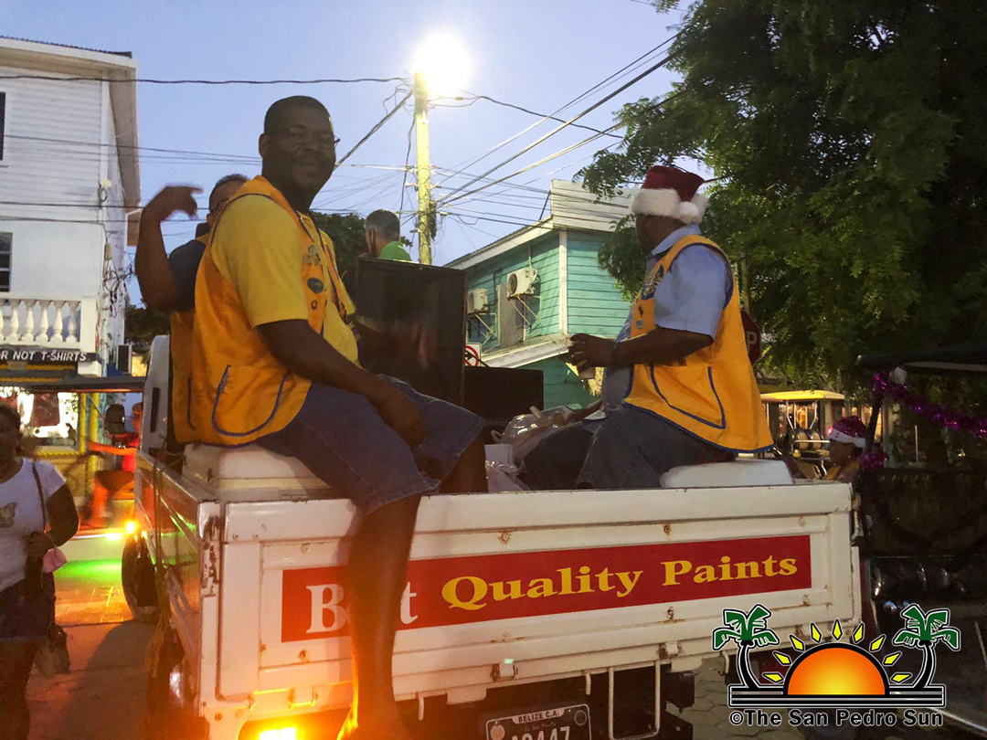Dr. Sol Yam, the Chair for Zone 59, which the island club is part of, was in San Pedro over the weekend and joined her fellow Lions in distributing food and the fun Christmas caroling. After 5PM on Sunday, December 19th, and with Rompe Raja singing classic Christmas carols, the Lions were again in the streets heading to the DFC Subdivision for the annual caroling. Along the route in DFC and on their way back to downtown, they distributed candies and apples to both children and adults. Many families came out of their homes, wave, thanked the Lions for the treats, and even danced and sang with Rompe Raja.