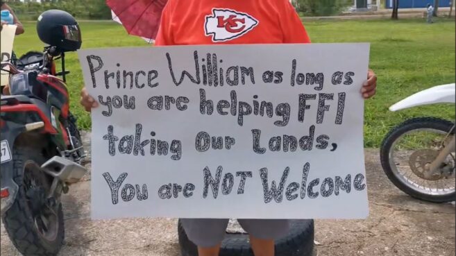 Some of the placards had messages demanding FFI’s patrons stop taking their land. Others demanded that FFI stay away from their village, while other posters read, ‘Prince William, as long as you are helping FFI take our lands, you are NOT welcome.’