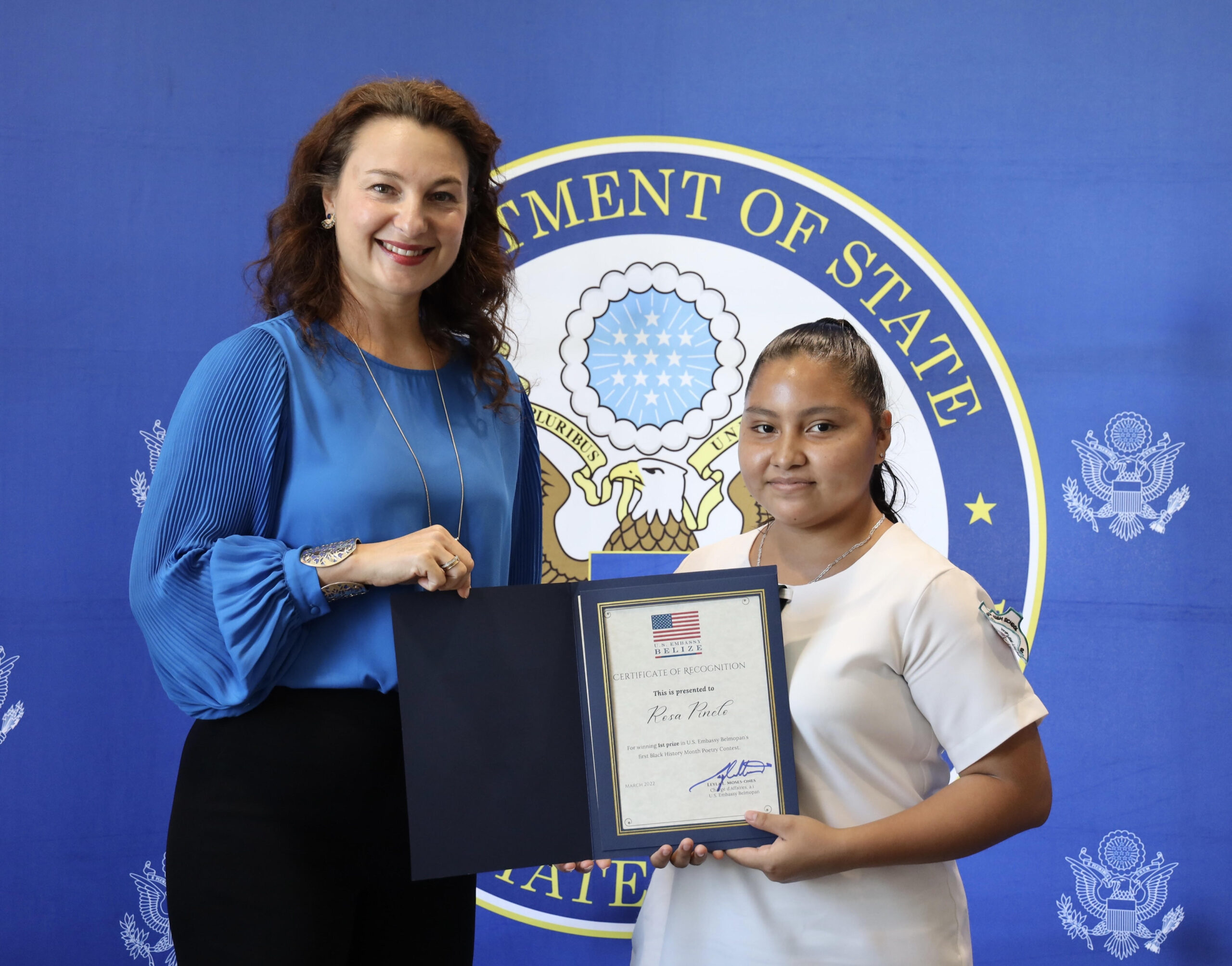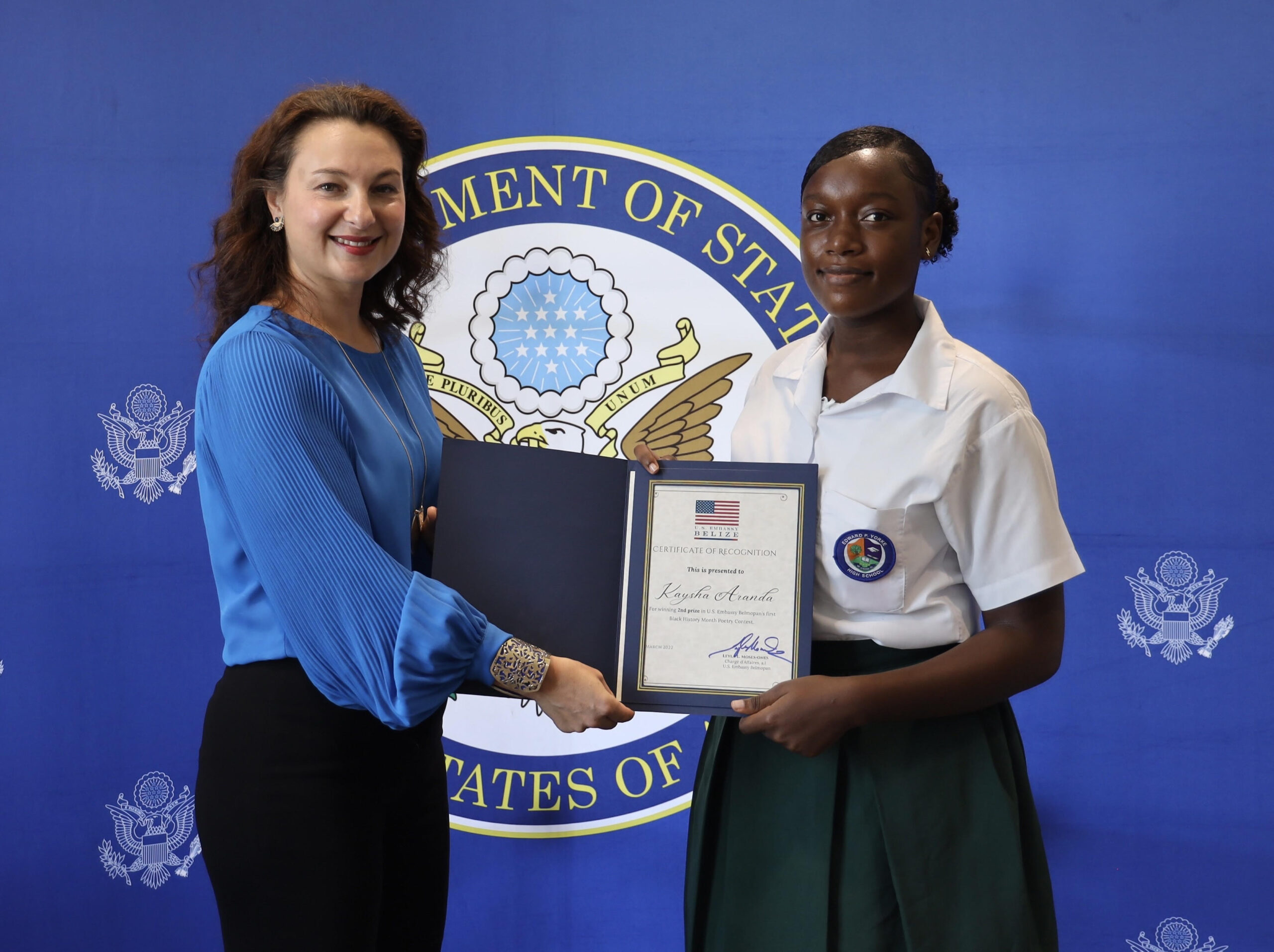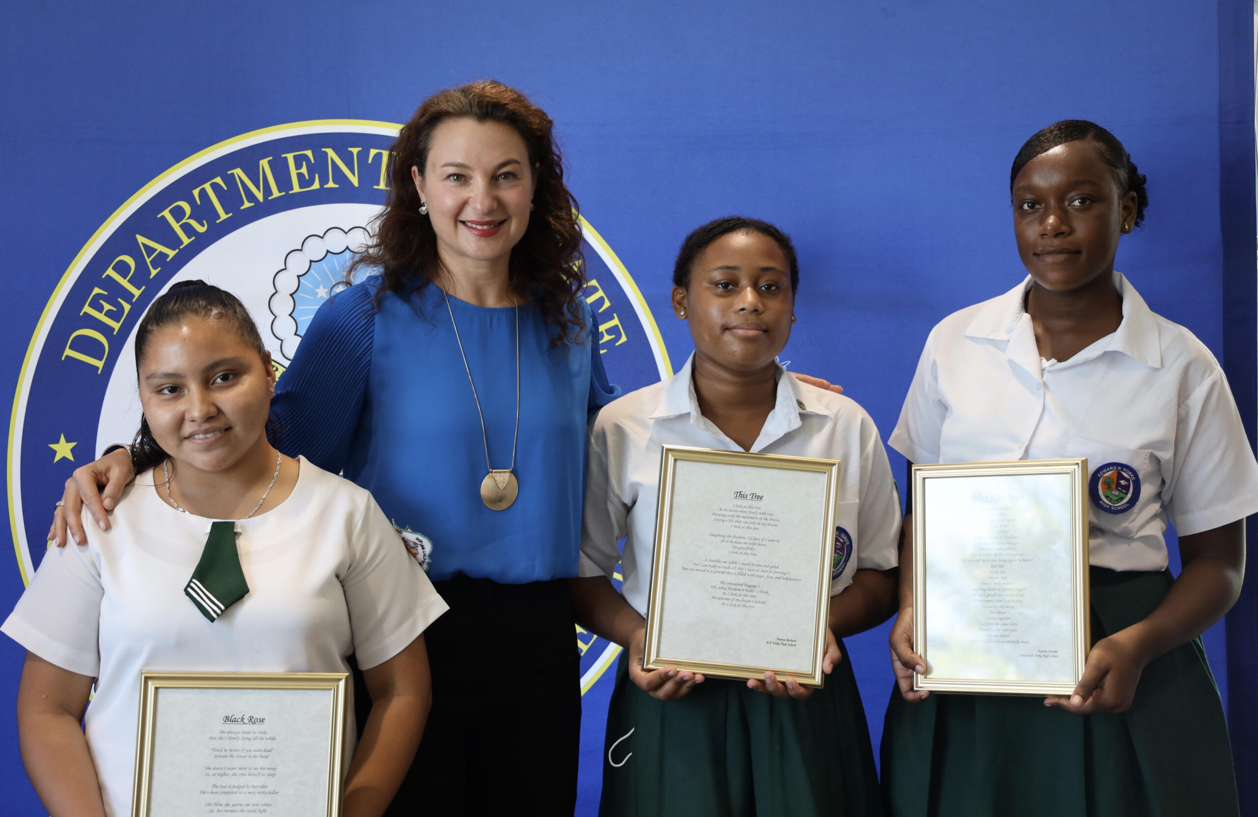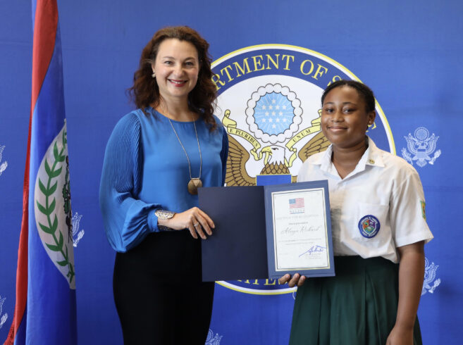U.S. Embassy Belmopan hosted the winners of the Embassy’s first-ever Black History Month Poetry Contest. Chargé d’Affaires, a.i. Leyla Moses-Ones recognized the three Belizean high school student winners during a special ceremony highlighting their inspiring works. Their visit included a tour of the U.S. Embassy where their framed poems have been on prominent display over the past month.