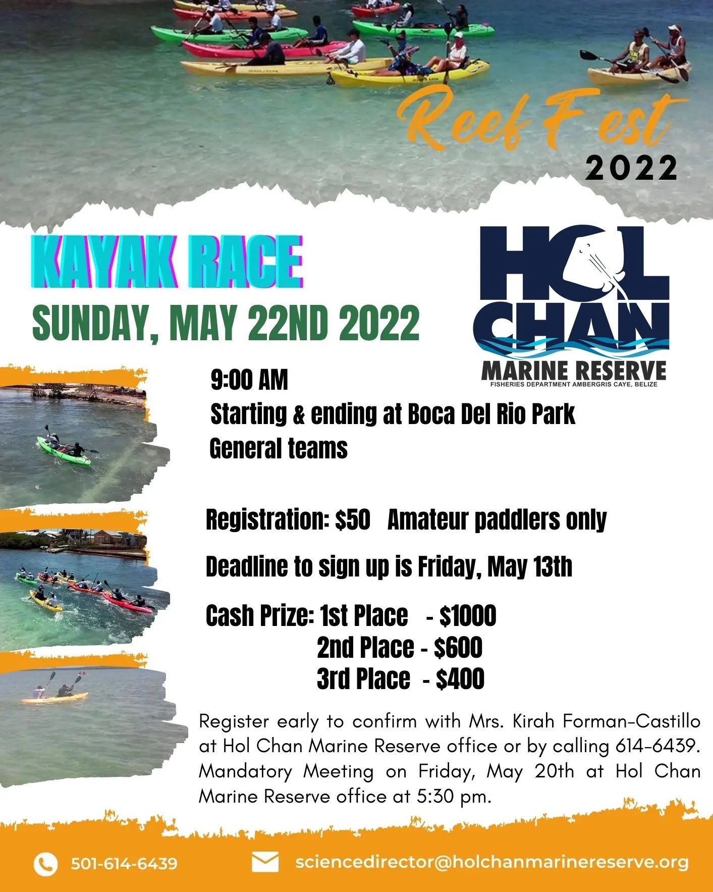 On May 22nd, Reef Fest will close with a kayak race in the morning, going around the island, starting and finishing at the Boca del Rio beach park. There will be a lionfish competition in the afternoon and a competition challenging participants to turn trash into art.
