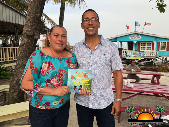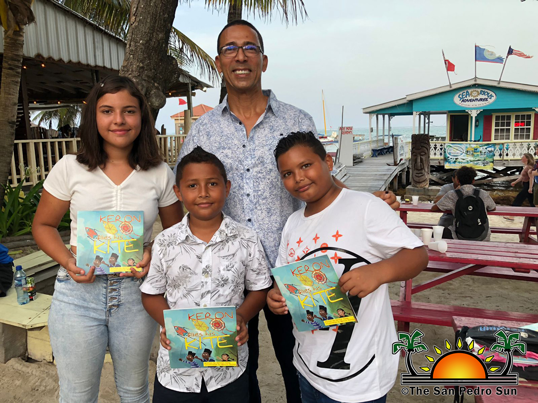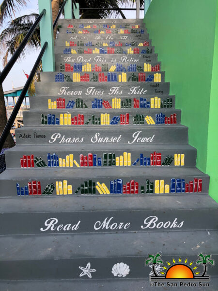 One of the project’s highlights is the decoration of one of the sets of stairs. Each stair has the name of a book painted on them along with the name of Belizean authors. One of those Belizean writers, Harold Young, attended the event and spoke about reading and his book, Keron Flies His Kite. He brought copies with him for purchase. Young cheerfully signed each copy for those getting one of his books and even snapped pictures with happy readers posing with his book.