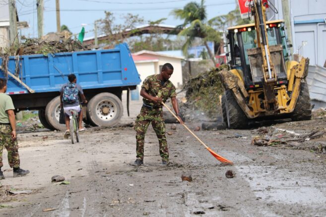 The City Emergency Management Organization (CEMO), supported by NEMO, kicked off the largest single contingent from the Belize Defence Force ever deployed on one task. The Ministry of Infrastructure Development and Housing (MIDH), supported by the private sector, is providing pro bono work with dump trucks and backhoe, and a massive 72-hour clean-up campaign in Belize City.