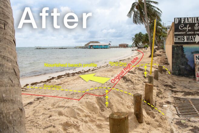 Following Hurricane Lisa on Wednesday, November 2nd, assessments were made to the site, and the SPTC reported that the project performed the way it was designed to work. The evaluations carried out by one of the project persons, Valentine Rosado, confirm that while other beaches around the island receded slightly due to the storm, the nourished beach showed a positive increase.
