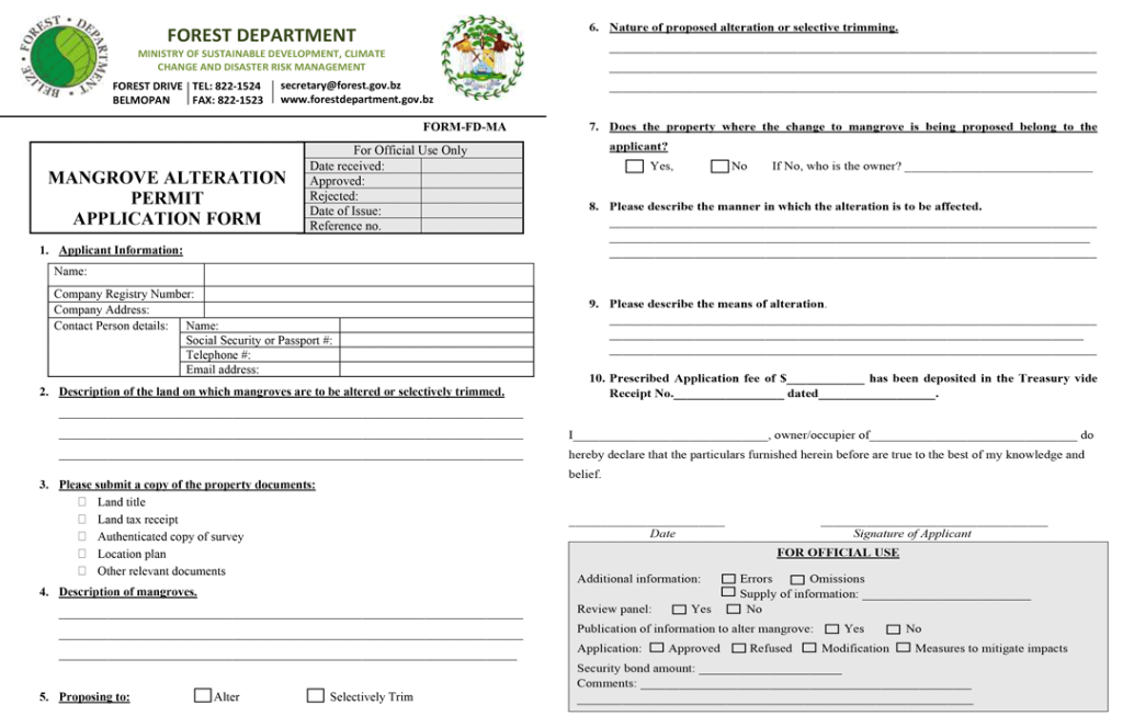 The Belize Forest Department advises anyone intending to trim or cut mangroves in or around their property must apply for a special permit. To apply for the permit known as ‘Mangrove Alteration,’ a form like the one below must be completed and submitted by email to [email protected] or dropped off at the offices of the Forest Department in the Capital City of Belmopan, located on Forest Drive.