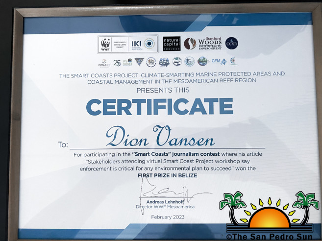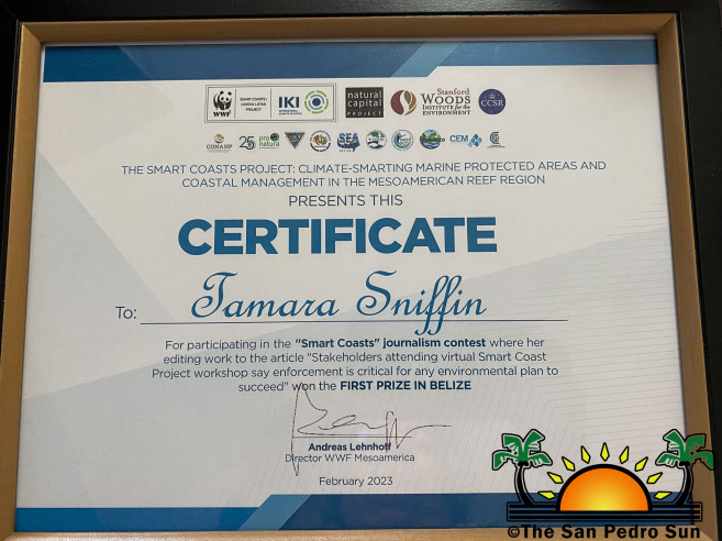 Senior Reporter with The San Pedro Sun Dion Vansen and Editor Tamara Sniffin recently received a “Smart Coasts” journalism award from the World Wildlife Fund (WWF Mesoamerica) for highlighting the need to enforce environmental laws in Belize. Their collaboration on an article published in 2021 titled “Stakeholders attending virtual Smart Coast Project workshop say enforcement is critical for any environmental plan to succeed” led to the recognition of first prize in Belize.