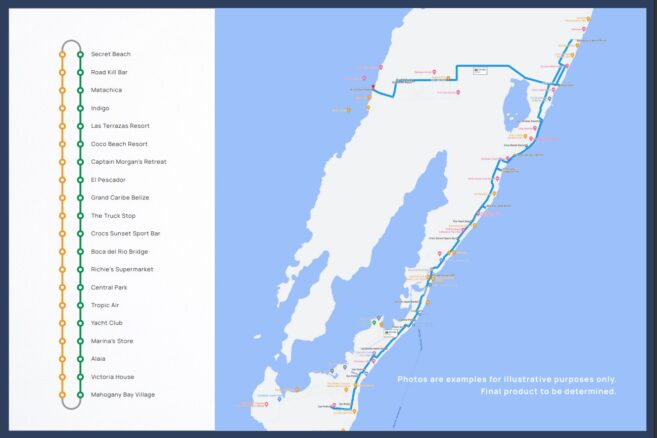 As per the international transport consultants, the size of the public vehicles was to be 14–16-seater shuttle buses. The initial operation was to operate 24- hours per day, seven days per week, and the service would create local jobs. The route includes 20 designated bus stops, ranging from Mahogany Bay Village in the south to Secret Beach in the north.