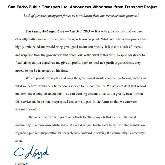 The proposed transportation project for San Pedro Town, Ambergris Caye, by the private entity, Taly Corporation, is taking an indefinite pause after the organization announced the withdrawal of its proposal. In an official letter, they noted the lack of communication from the current government administration in assisting in fulfilling the project geared toward the benefit of island residents.
