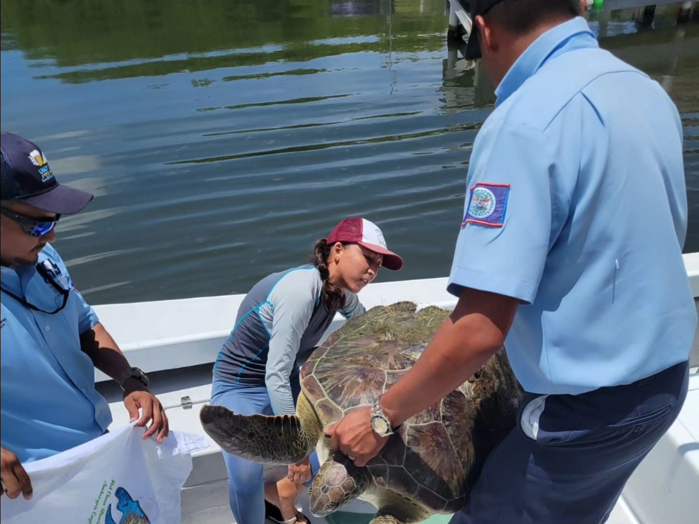A distressed female adult Green Sea Turtle was assisted on Tuesday around 6:30PM after being rescued from the lagoon side near downtown San Pedro. Members of ACES Wildlife Rescue spotted the troubled turtle and monitored its safety until personnel from the Hol Chan Marine Reserve (HCMR) arrived. The injured turtle was taken to Hol Chan’s base for evaluation and transported to Belize City, where the Fisheries Department will observe her.