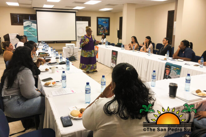 Those attending the SBCC session, female in the majority, represented different sectors of the island community. These included San Pedro Town Council councilors, the San Pedro Police Formation, Hope Haven Children Shelter, advocates, and the private sector. The 9AM to noon session was very interactive, with the presenters discussing equality between men and women. The presentations touched on traditional practices still tolerated today in which women are marginalized and deprived of specific social posts and activities.