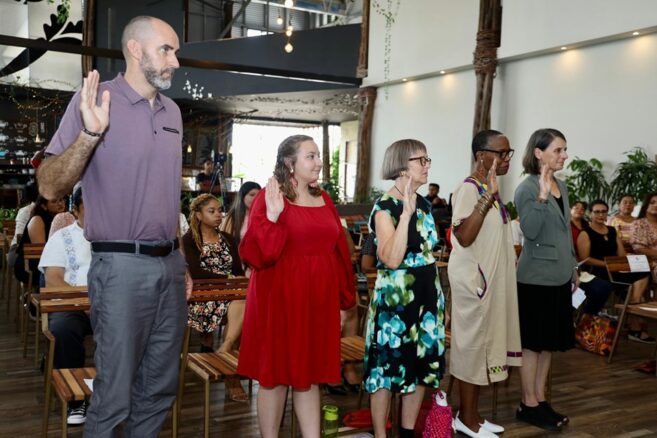 BELMOPAN, BELIZE August 25, 2023 – Peace Corps Belize swore in a group of six new Peace Corps Response Volunteers at a ceremony in Belmopan. For the next nine months, Response Volunteers will focus on transferring skills to 13 primary schools’ lower-division teachers, empowering them to offer small-group literacy intervention instruction to children reading below grade level. The short-term, high-impact program includes senior professionals and returned Peace Corps Volunteers with advanced degrees and specialized certifications.
