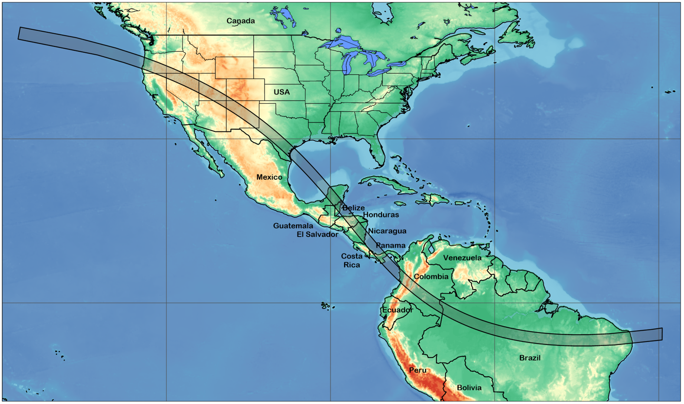 Of importance is that the annular eclipse will only be viewable within the red region, as seen on the map below. The map also shows a timeline of the eclipse and the places it will be fully observed.
