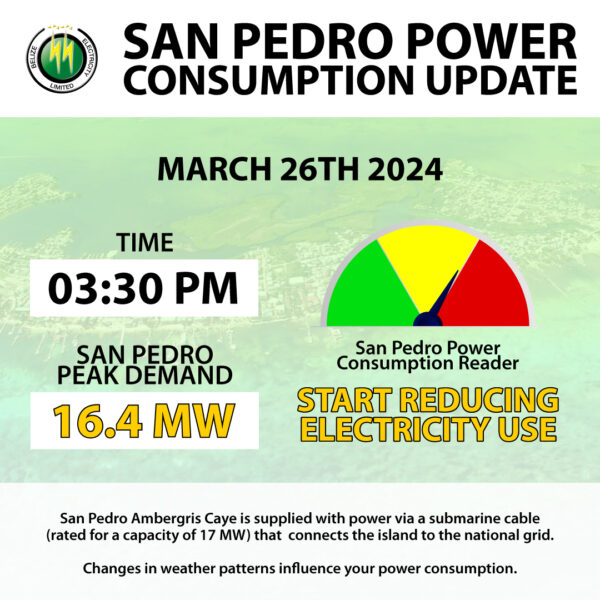 Afterward, various switching operations were conducted on the distribution feeders to Ambergris Caye to manage the demand so that it remained below the maximum capacity of the submarine cable. This continued until 9:25 PM when the demand subsided, and power was restored. The energy demand in San Pedro will continue to be monitored as the heatwave and increased activities leading up to and throughout the Easter weekend will drive up energy consumption.