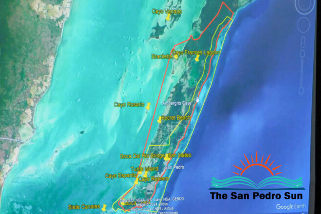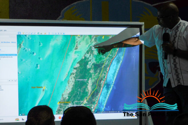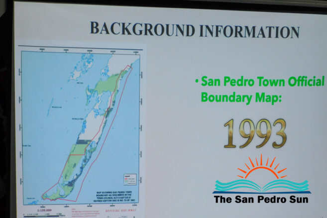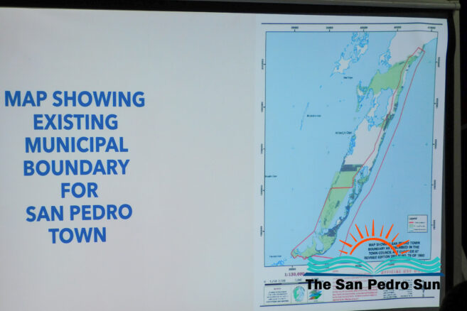 King continued the session with a presentation showing the existing boundaries of San Pedro marked in yellow. The map depicts that the SPTC jurisdiction narrows toward the island’s northern area. The town authority’s jurisdiction widens toward the southern portion of Ambergris Caye. The proposed expansion marked in yellow will allow the SPTC to have a broader jurisdiction toward the northern portion of the island. Some areas included in the new municipal boundary expansion include Secret Beach and as far north as Cayo Frances Lagoon.