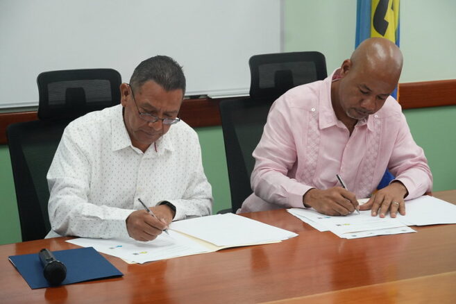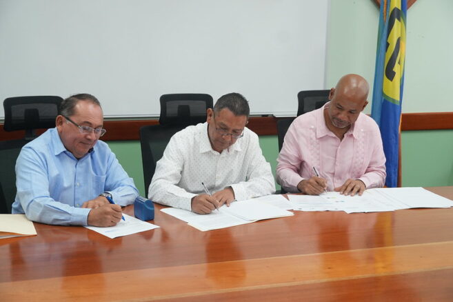 The Honorable André Perez, Minister for Blue Economy and Disaster Risk Management; Carlos Pol, Acting Chief Executive Officer for the Ministry of Economic Development; and Dr. Colin Young, Executive Director of the Caribbean Community Climate Change Centre (5Cs), signed on behalf of the GO. Mayor Wally Nuñez of San Pedro Town, Mr. Cornelio Acosta, Executive Chairman of Belize Water Services Limited (BWSL), and Ms. Diane Wade, Head of the Project Development Management Unit at 5Cs, witnessed the signing.