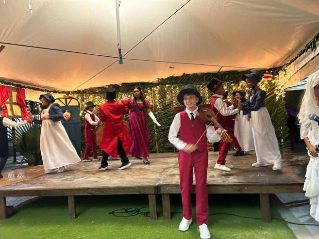 A highlight of the pageant was the musical play “A Dickens of a Christmas,” based on Charles Dickens’s classic tale, “A Christmas Carol.” Students from Standard 2 through Standard 6 presented this performance. The story follows Ebenezer Scrooge as the ghosts of Christmas past, Present, and Future visit him. Through this journey, Scrooge confronts the consequences of his selfishness and learns to honor Christmas in his heart.