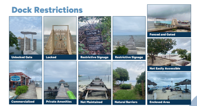 The research indicates that full parcel development on South Caye Caulker could potentially cover 33.28% of the coastal access reserve. Currently, building encroachment occupies 5.31% of this reserve. At the current rate of development, it is projected that building encroachment could exceed 140,000 square feet, or 8.27% of the coastal reserve, by 2030. The study also identified several barriers to coastal access, including physical barriers such as gated entrances to docks as well as symbolic barriers, encroaching structures, and the commercial use of public spaces. Nearly half of all docks are classified as having Fair Accessibility (27%) or Very Low Accessibility (22%). Key factors affecting access include physical barriers, surrounding land use, safety and maintenance conditions, signage, and the usage and features of the docks. “16.38% of docks have gated entrances, 63.16% of which are locked during daylight hours. 57.76% of docks face restricted access due to physical barriers, and 25.86% have prohibitive signage,” stated the report.