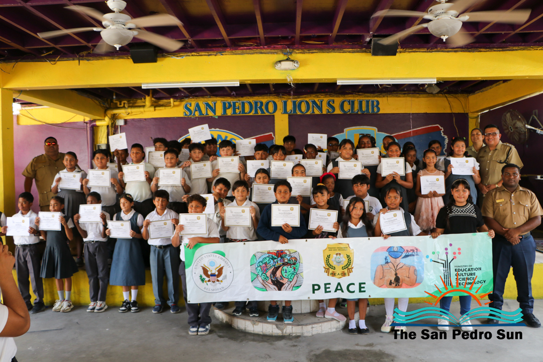 The San Pedro Police Department, in collaboration with the Ministry of Education, Science, and Technology (MoEST), hosted the Positive Engagement and Civic Education (PEACE) graduation ceremony on Monday, June 24th, at the Lions Den. Two hundred thirty-one students from Holy Cross Anglican School and Isla Bonita Elementary School received certificates for completing the PEACE program.
