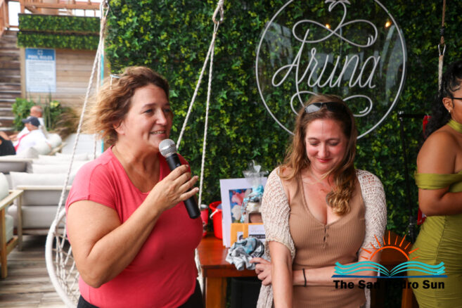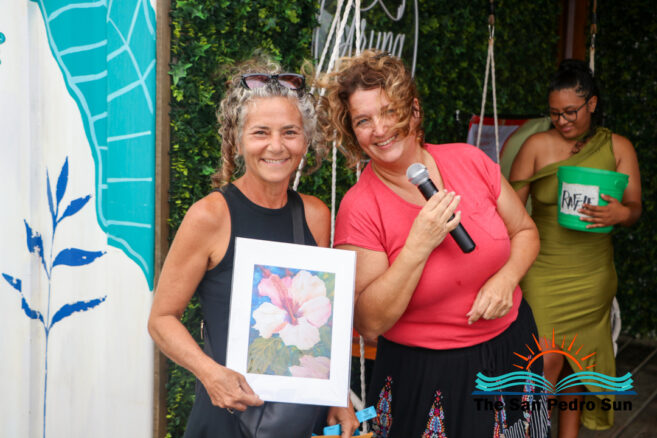After enjoying food and drinks, the giveaways began, and raffle tickets were purchased for both prize drawings and the 50/50 cash raffle. Guests had the chance to win various prizes, including $50 gift certificates from Moon Bar, Frenchy’s Bakery, Level Up, Fresh Express, and The Alibi. Other notable prizes featured a hibiscus painting print by Ellie Guerrero Staines, an Original Guitar Circle rash guard, and a gift certificate for two at Paint N Splash. Larger prizes included $100 gift certificates from Opus Ocean Grille and El Fogon, as well as $150 gift certificates from Someplace South and Gypsy. There were also one-night stays at Aqua Vista and Playa de Sala, a sunset cruise for two aboard YOLO, a two-night stay at Aruna, and a $300 gift certificate to Akasha, adding to the evening’s excitement and generosity.