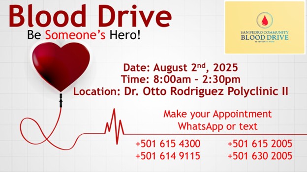 The San Pedro Community Blood Drive Group encourages everyone to participate in the upcoming blood drive on Friday, August 2nd, at the Dr. Otto Rodriguez Polyclinic II, from 8:00AM to 2:30PM. To make an appointment, WhatsApp or text: 615-4300, 615-2005, 614-9115, or 630-2005.