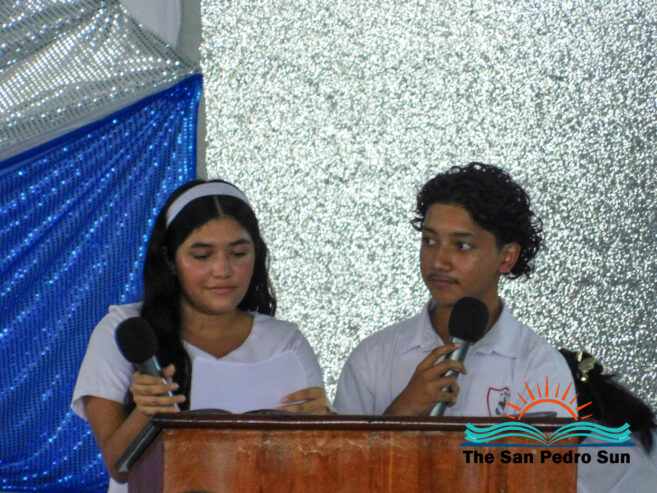 Holy Cross Anglican School paid tribute to the flag before students from The Island Academy delivered welcome remarks. The emcees then recognized the participating schools: Isla Bonita Elementary, Ambergris Caye Elementary, Holy Cross Anglican, New Horizon SDA, San Pedro RC, The Island Academy, and SPHS.
