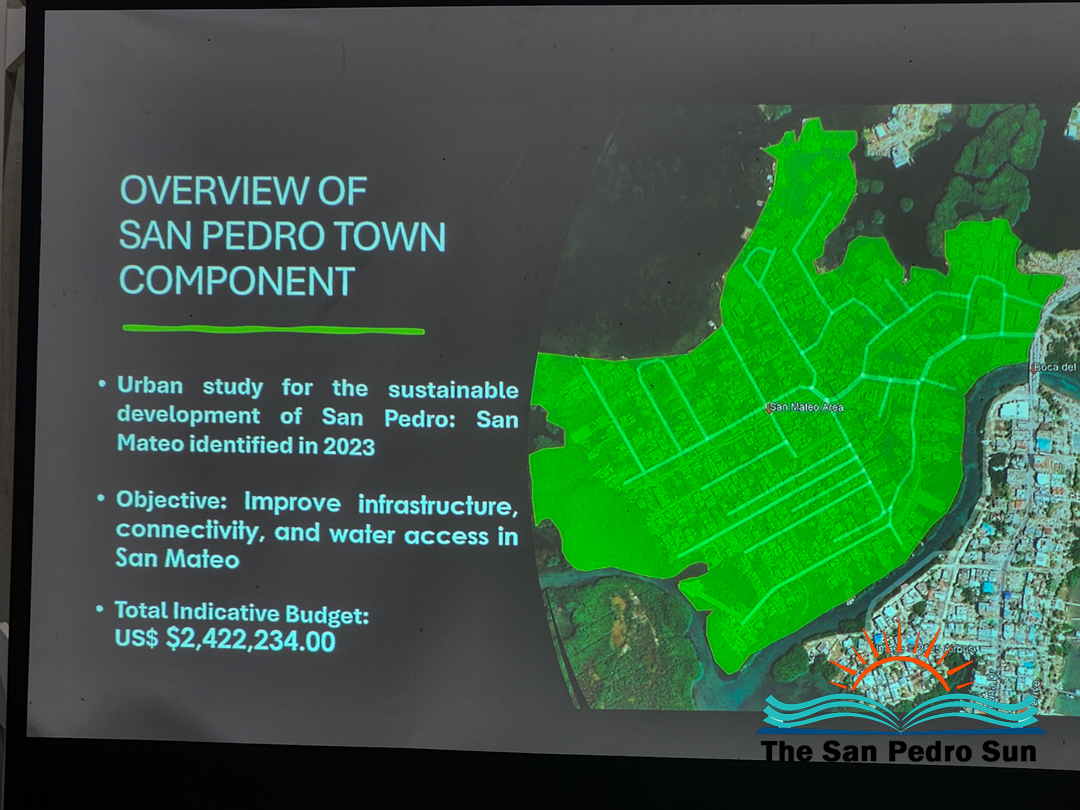 Central Executive Unit project engineer Falen Escalante presented details of the substantial urban development program, known as Project 1046, which focuses on improving San Mateo’s infrastructure connectivity and water access. The phase one budget totals $3.4 million BZD and includes street upgrades, construction of sidewalks, bike paths, and concrete pavement, as well as energy-efficient lighting and traffic signage. “We are doing design build… to shorten the process… to get infrastructure within San Mateo as soon as possible,” Escalante explained.