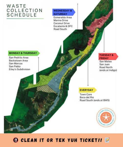 According to a recently released map and information shared by Town Council Operations Manager Alex Eck, collection schedules are divided by area. San Pedrito, Backatown, the San Marcos area, the San Pablo area, and Eiley’s Subdivision are serviced on Mondays and Thursdays. San Mateo, the San Juan area, and the road north to Indigo receive collection on Tuesdays and Fridays. Marina Drive, Coconut Drive, Escalante Road, DFC, the Emeralda area, and the road south are serviced on Wednesdays and Saturdays. Daily collection takes place from Boca del Río through the town core, along the beachfront, and south to Belize Water Services (BWS).