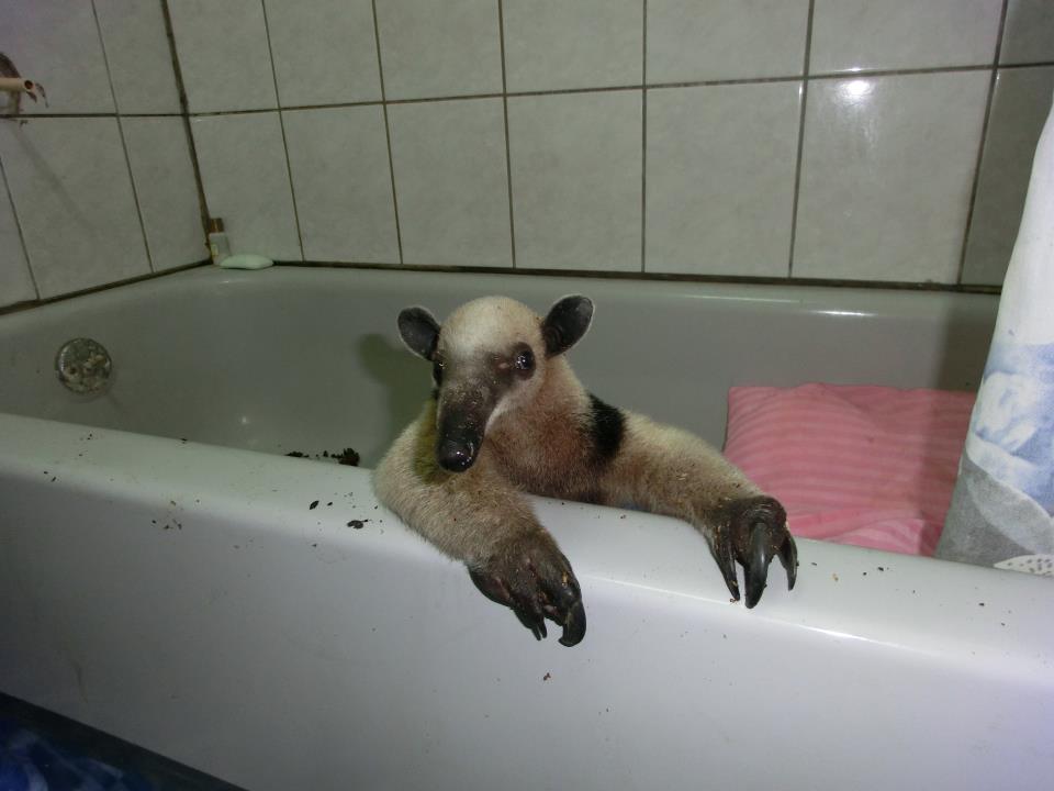 The suffering Anteater, affectionately dubbed “Tia” (Aunt in Spanish) was found in San Juan under a London bridge in polluted water. According to Cherie, ACES was on a crocodile call in the area, when the little critter was found dehydrated, and apparently very tired. Her tail was bleeding from about three places and appeared to have bite marks, slightly healed, on her nose and neck.