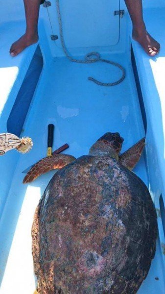 “We recognized it as the friendly loggerhead turtle from Chato’s Graveyard, and of course, the poor animal looked like it was drowning,” said Soto. “We would see it sinking underwater, then try to come up again for air. There were boats passing but they didn’t notice.” He says that they quickly began signaling and calling for help any way they could, until one boat stopped. After explaining the situation, that boat captain caught the attention of a Marine Park Ranger, who eventually was able to pull the turtle out of the water and into their boat.
