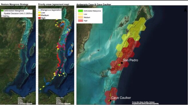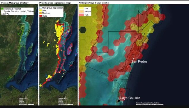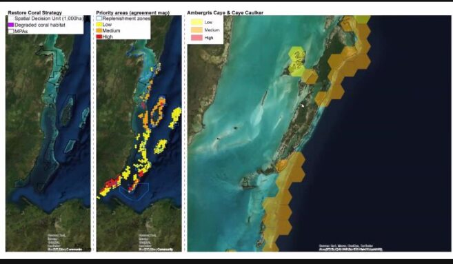 A couple of modules shared in the virtual workshop showed where mangrove restoration areas on Caye Caulker and Ambergris Caye are badly needed. The priority areas appeared in bright red, revealing where massive mangrove deforestation has taken place for tourism development. The modules also showed areas near the islands that need reef restoration. Many of the corals in those areas have been damaged and must be restored to save the tourism product that also protects our shorelines.
