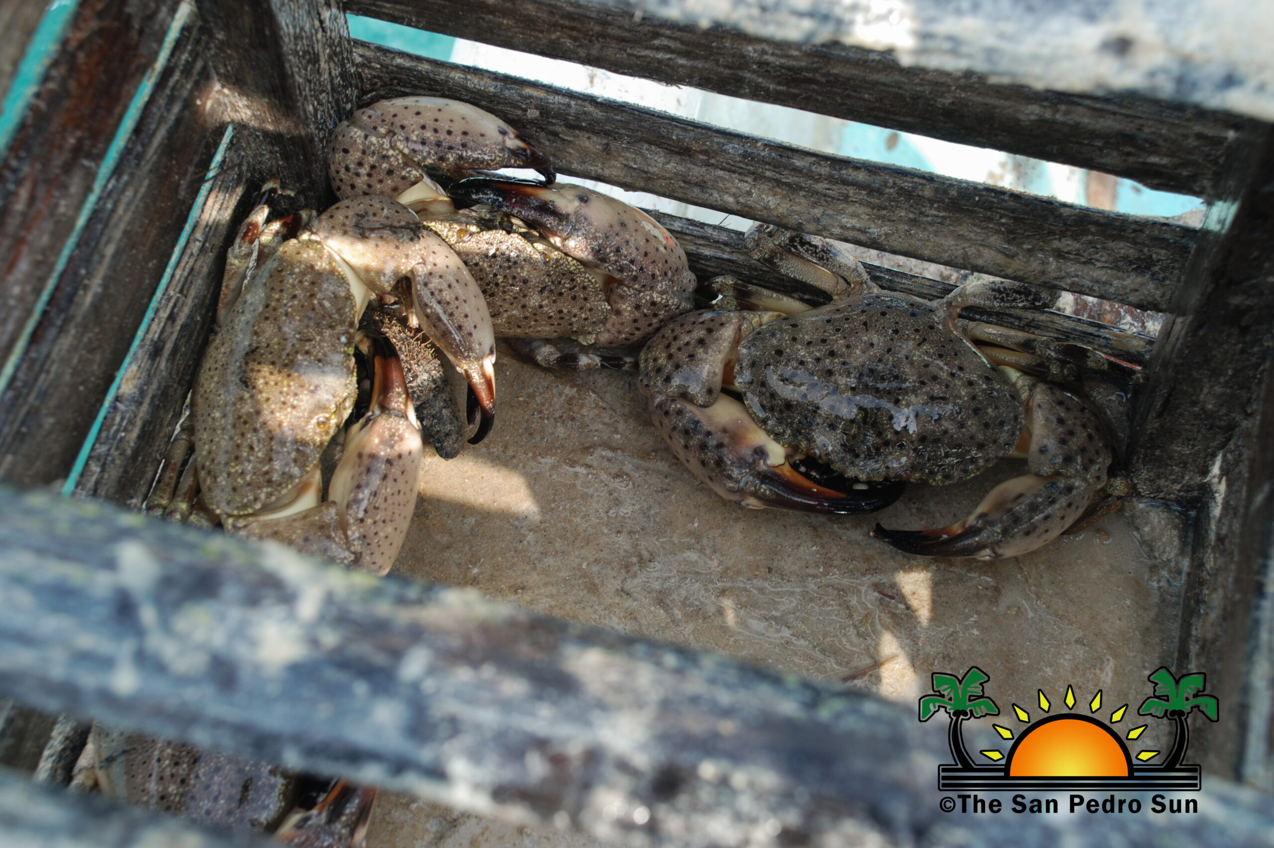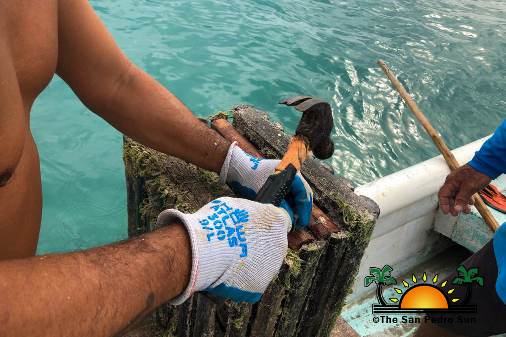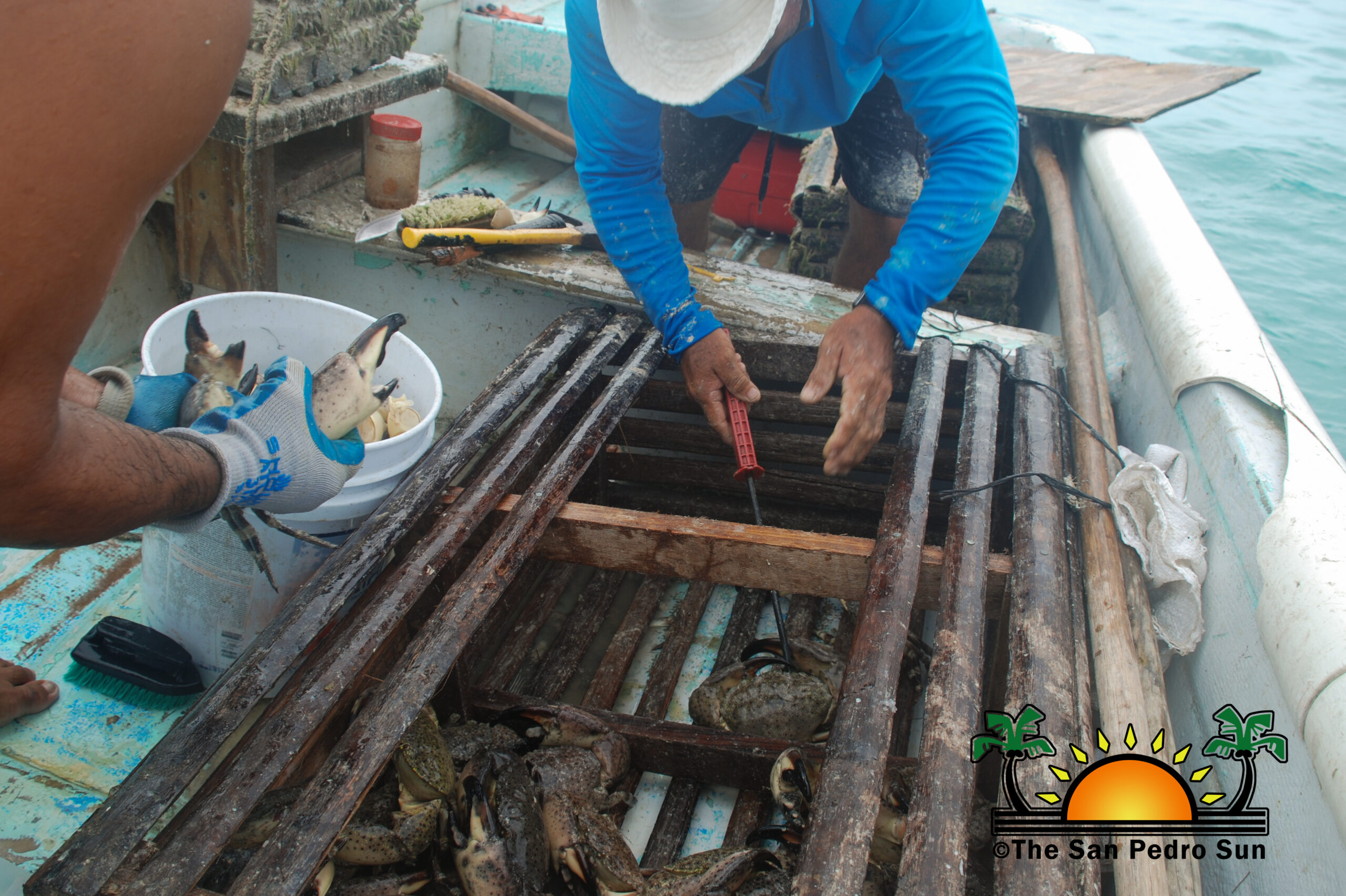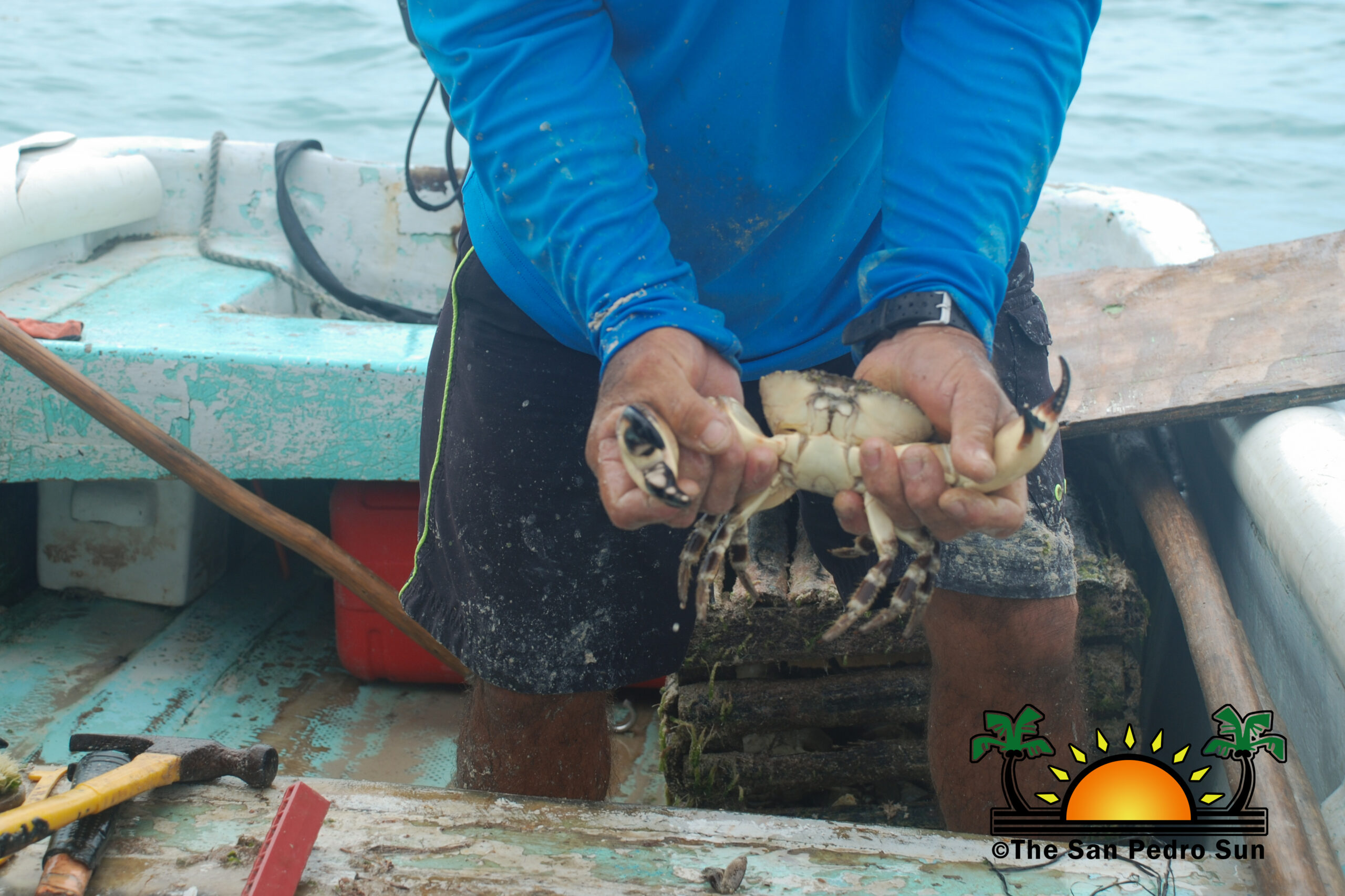 Early in the morning, Chan and his helper load his little panga (boat) with the necessary tools, crab traps (small boxes), storage vessels for the claws, water, and some food. Afterward, it’s time to head out to his fishing grounds some 30 minutes southwest of Caye Caulker. Chan explained that each licensed crab fisherman has designated fishing areas identified with themed buoys or sticks. These areas are essential for each fisherman to ensure a successful catch each visit.