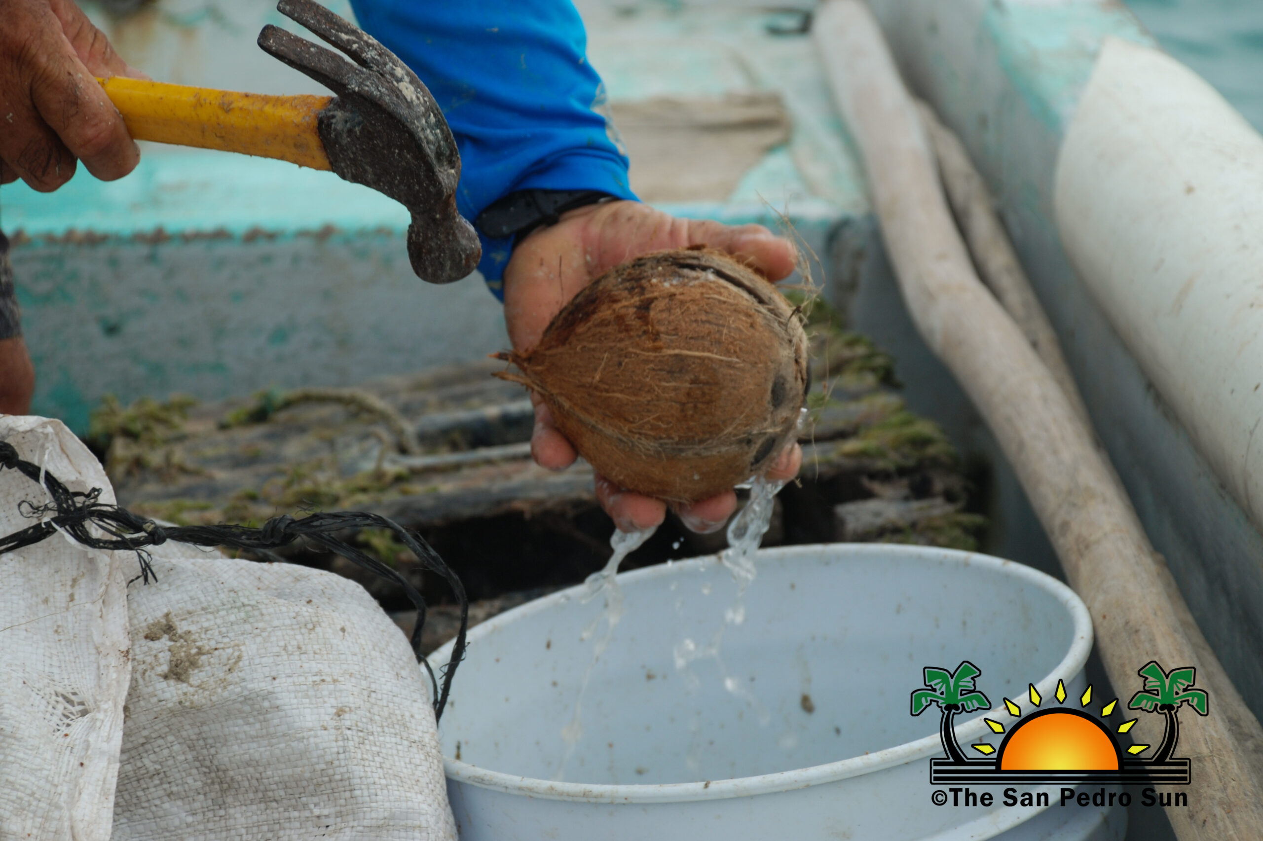 After assuring they are of legal size, Chan places the first crabs inside a large wooden box as the fishing continues. Most of the declawing occurs at the end of the fishing period. Before returning the trap to the water, Chan chops some coconuts and places them inside to attract the crabs, who love eating coconut meat. The crab trap will remain in the water for about two weeks. However, if the demand increases, Chan may pull them out of the water before that period.In the following hours, Chan maneuvers the boat in circles locating the traps and fetching them out of the water. Some have more crabs than others, others are empty, and some show signs in the wood where the crab has cut its way out. Chan has a hammer, boards, and nails to repair the damaged traps.