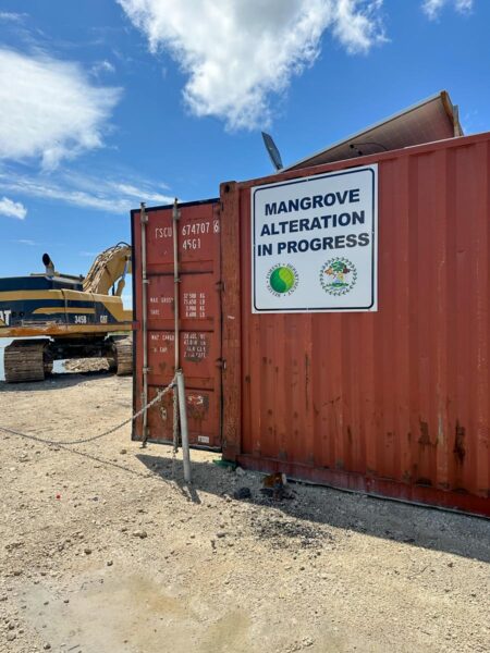 Another area showing mangrove destruction is at the south end of the John Greif II Municipal Airport’s runway. Again, mangroves have been chopped down and a large area is being filled with material for another construction project. No signage could be identified showing that these projects have received a permit from the Forestry Department to clear mangroves.